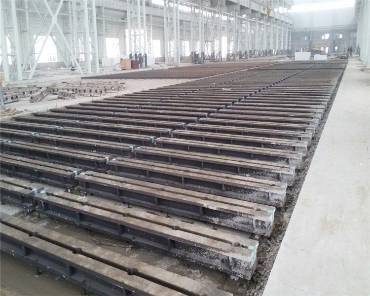 重型地軌采用優(yōu)質(zhì)高強(qiáng)度灰口鑄鐵HT200-250,工作面硬度為HB170-240,鑄件經(jīng)過(guò)兩次人工退火600℃-700℃或自然時(shí)效2-3年,完全去除內(nèi)應(yīng)力,精度穩(wěn)定,耐磨性能好。重型地軌根據(jù)設(shè)備的固定點(diǎn)來(lái)設(shè)計(jì)、拼接成鑄梁平臺(tái),主要用于大型設(shè)備的裝配、試驗(yàn)、焊接和檢驗(yàn)。