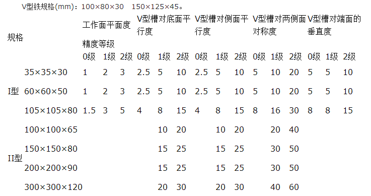 V型鐵按國家GB4972-85標(biāo)準(zhǔn)制造,一般都成對(duì)供應(yīng),是一個(gè)四棱體,四個(gè)工作面上或四個(gè)尺寸不同的90度的槽。主要適用于軸類零件的檢驗(yàn)和劃線。